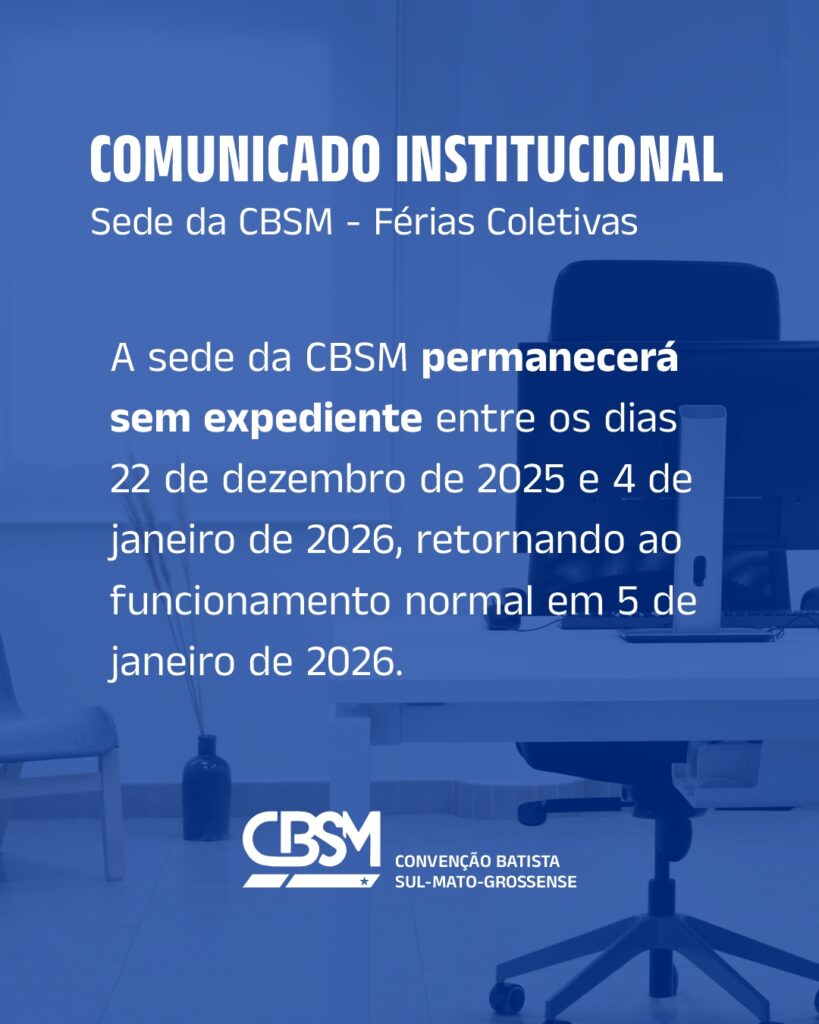 COMUNICADO INSTITUCIONAL Sede da CBSM — Férias Coletivas 2025 A Convenção Batista Sul-Mato-Grossense informa que, a partir de 2025, adotará o sistema de Férias Coletivas para sua equipe administrativa. Nesta primeira edição do novo modelo, a sede da CBSM...