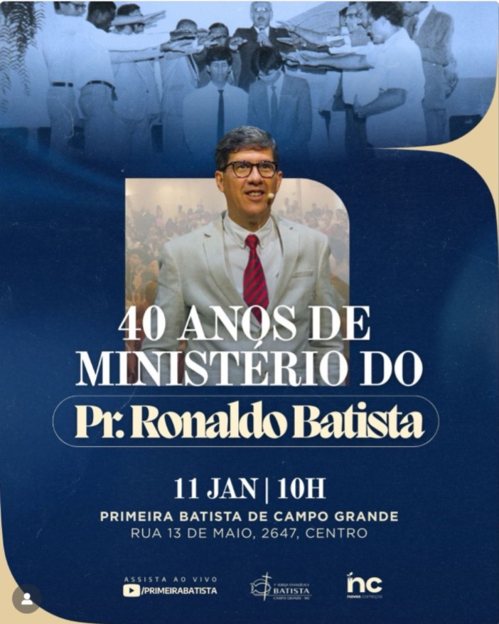 É com grande alegria e profundo sentimento de gratidão a Deus que informamos que, no dia 11 de janeiro de 2026, no horário das 1Oh, será realizado o Culto de Ação de Graças pelos 40 anos de ministério do Pastor Ronaldo Leite Batista.