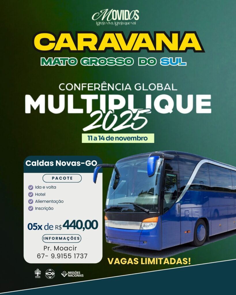 Você, irmão e irmã do Mato Grosso do Sul, está mais que convidado para fazer parte da nossa Caravana Multiplique 2025! Vamos juntos para Caldas Novas (GO), de 11 a 14 de novembro, viver dias de renovo, visão e despertamento com o tema: “MOVIDOS: Igreja Viva, Igreja que Vai!”